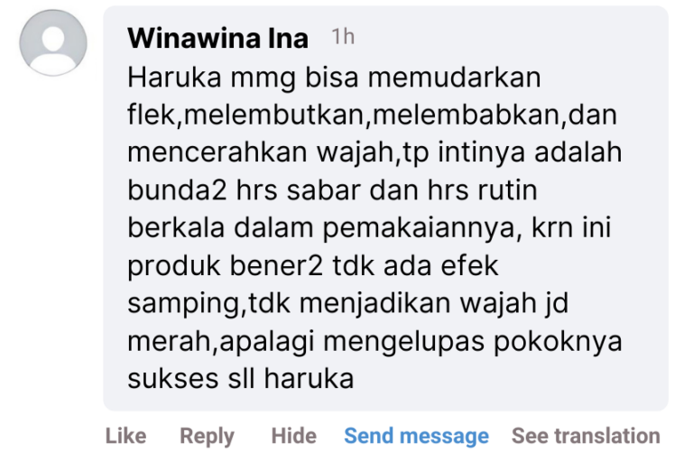 “Beneran buaagus banget hasilnya! Flek hitam di wajah di pipi kanan dan kiri yang membandel bisa menipis setelah pakai Haruka. Selain itu, wajah juga lebih sehat, cerah, dan bersih.”